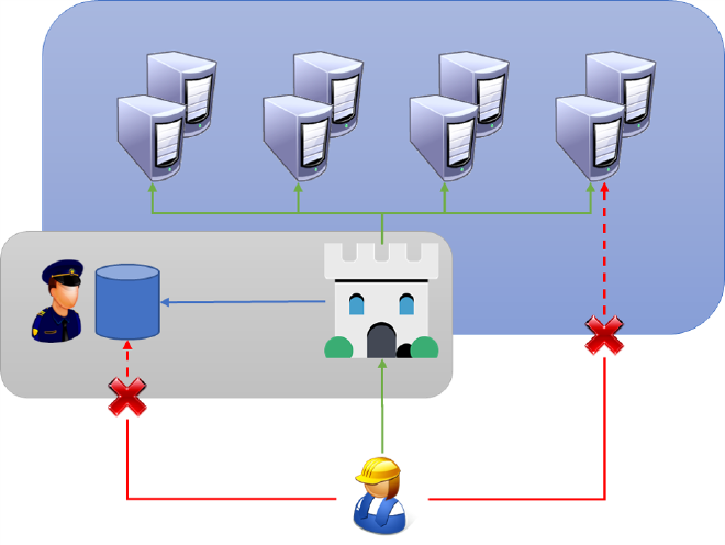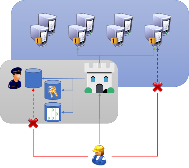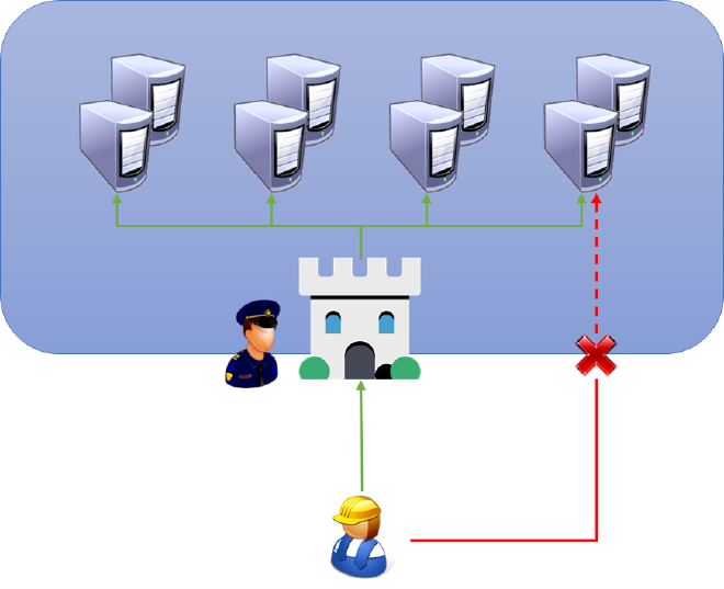 Le principe est exactement le même en informatique : tous les accès doivent passer par l’équivalent du péage, que l’on nomme bastion. Le bastion se charge de collecter les traces d’audit nécessaires : le fameux QQCOQP (qui-quoi-comment-où-quand-pourquoi). On n’oubliera pas de bloquer toutes les tentatives de connexion qui ne passeraient pas par le bastion, au risque de rendre ce dernier inutile.